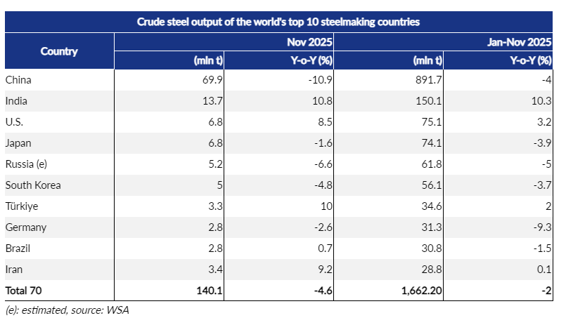China, the world's largest steelmaker, produced 69.9 million tonnes of crude steel in November, thinning by 10.9% on year and hovering below the 70-million-tonne threshold for the first time this year. Its November output also slipped by another 2.9% from October, marking the eighth consecutive on-month drop, Mysteel Global calculated based on the WSA statistics.